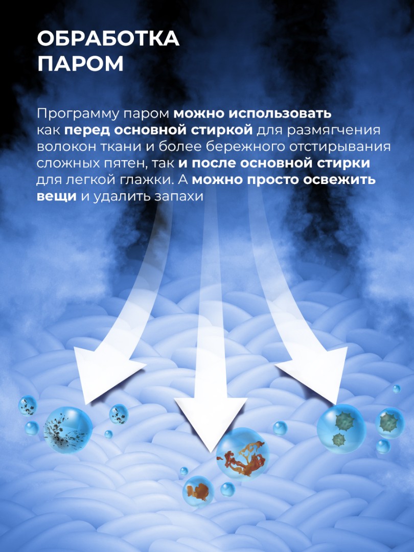 - Функция обработки паром позаботится о ваших вещах и при этом справится с самыми стойкими загрязнениями и уничтожит 99 % бактерий. Пар, проникая в волокна ткани, cмягчает ее и дезинфицирует.