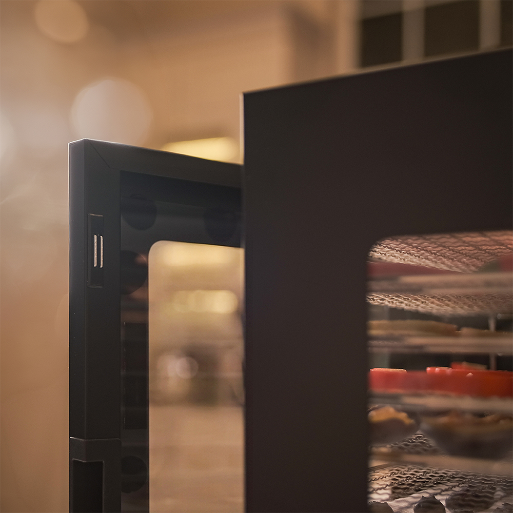 Чёрный корпус из нержавеющей стали, устойчивый к нагреву, влаге и коррозии, выглядит лаконично и современно, легко вписывается в интерьер кухни или мастерской. Внутри установлено 8 поддонов из нержавеющей стали с зазором 25 мм — этого достаточно, чтобы удобно размещать ломтики фруктов, травы или мясные полоски.